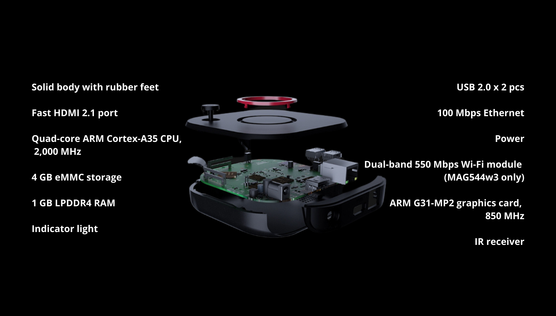 The MAG544 and MAG544w3 are Infomir’s IPTV set-top boxes powered by Linux OS. These devices come with the Amlogic S905Y4 chipset and quad-core ARM Cortex-A35 CPU. They play video stably and smoothly in all modern formats, including 4K.